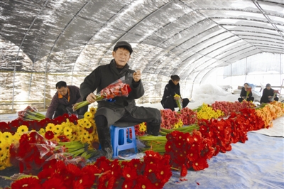 近年来,定远县扎实推进贫困村“一村一品”项目建设,为贫困村增收脱贫打牢基础。截至目前,该县贫困村特色种养业扶贫项目已达194个,村均2.77个,已建设贫困村特色种养业扶贫基地110个。图为吴圩镇站岗村的产业扶贫基地,贫困户正在把收获的非洲菊装袋打包。