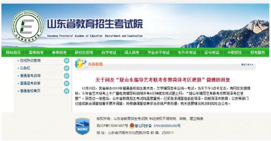 人民网北京12月16日电 据山东省教育招生考试院网站消息,12月15日,山东省举办2019年普通高校招生美术类、文学编导类专业统一考试。当天下午3点半左右,有网友发微博称,今年省艺术统考上午广播电视编导科目刚开考4分钟就发现试题上网,“疑山东编导艺考联考作弊菏泽考区泄题”。