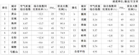 注:(1)空气质量排名采用空气质量综合指数大小来确定,指数越小表明空气质量越好,指数相同的城市以并列计。 (2)空气质量综合指数是指评价时段内,参与评价的各项污染物的单项质量指数之和(单项指标评价时段内平均浓度与该指标二级标准限值的比值,SO2、NO2、PM10及PM2.5采用年均浓度二级标准限值、O3和CO采用日均浓度二级标准限值),指数越大表明城市空气污染程度越重。 (3)空气质量综合指数同比变化率指本年度评价时段内空气质量综合指数与上年同期变化幅度,变化率大于0代表空气质量恶化、小于0代表改善、等于0代表持平。
