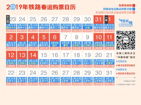 经济日报-中国经济网记者了解到,2019年铁路春运从1月21日起至3月1日止,共40天,全国铁路预计发送旅客41330万人次。据该负责人介绍,2019年铁路春运能力与往年相比将有较大提高,节前共安排开行旅客列车4787对,同比增加468对,平均每天可提供运能942万个席位,同比增长5.4%;节后共安排开行旅客列车4860对,同比增加460对,平均每天可提供运能964万个席位,同比增长5.2%。但春运期间旅客集中出行时段、能力紧张方向和紧张区段,仍难以满足购票需求,还需发挥综合交通运输方式的作用,即将推出的候补购票服务试点就是铁路部门根据春运特点进行的改善旅客购票体验的创新措施之一。(记者 佟明彪)