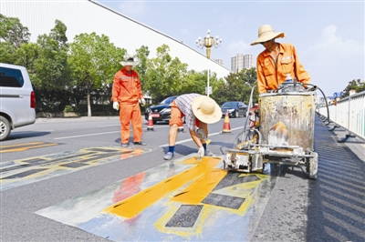 工人正在斑马线前施划“礼让行人”标识以警示市民注意交通文明,做文明滁州人。