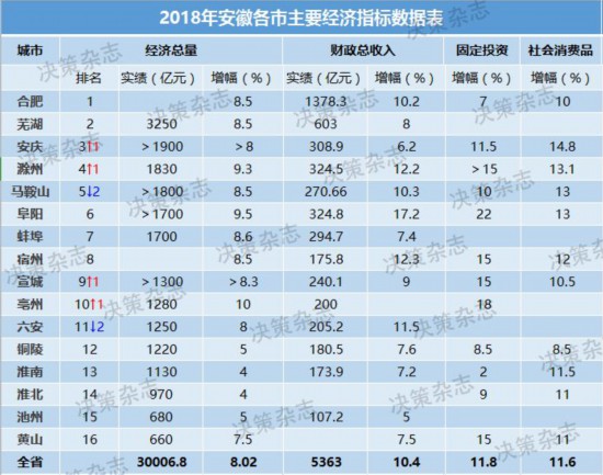 相比2017年:安庆上升一位,反超马鞍山,重回第三位;滁州凭借强势势头,也上升一位,位居第4;马鞍山下落到第5位。宣城和亳州各上升一位,分别位居第9和第10,六安下降2位,位居第11位。