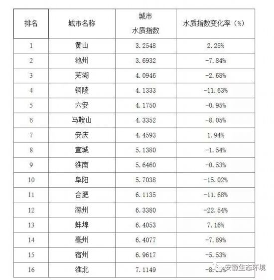 安徽省生态环境厅近日公布2018年全省16个市地表水质量排名,根据排名,黄山、池州、芜湖三市分列前三。