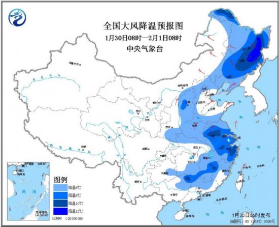 人民网北京1月30日电据中央气象台预报,未来三天中东部大部地区将先后降温6~8℃,部分地区降温可达10~12℃。2月1日最低温度0℃线将南移至长江流域。长江中下游及以北地区将相继出现4~6级偏北风;东部和南部海区有6~8级、阵风9级的大风。中央气象台今晨6时继续发布寒潮蓝色预警。