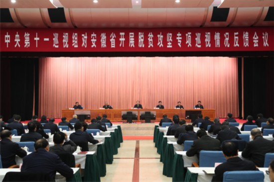 根据党中央统一部署,2018年10月18日至11月30日,中央第十一巡视组对安徽省开展了脱贫攻坚专项巡视。巡视组坚持以习近平新时代中国特色社会主义思想为指导,深入贯彻党的十九大精神,牢固树立“四个意识”,坚定“四个自信”,把“两个维护”作为根本任务,贯彻中央巡视方针,牢牢把握脱贫攻坚专项巡视的再监督工作定位,聚焦脱贫攻坚政治责任深入开展监督检查,督促各级党组织和领导干部强化政治责任担当,推动解决脱贫攻坚过程中存在的突出问题,为如期实现脱贫攻坚目标提供坚强政治保障。中央巡视工作领导小组听取了巡视组的巡视情况汇报,并向中央政治局常委会会议报告了有关情况。