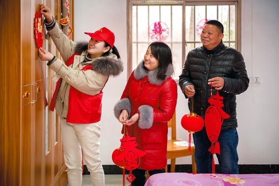 1月29日,滁州市来安县施官镇扶贫干部用窗花装扮贫困户高原、王梦影的新家。 2018年该镇投入550.2万元用于161户贫困户的危房改造,春节前,全部竣工并通过验收。通讯员 吕华 摄