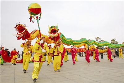 2月7日,大年初三,农村改革发源地凤阳县城区锣鼓喧天,热闹非凡,来自该县各乡镇的民俗表演队通过踩街的形式向全县人民拜年,花鼓灯、钱杆子、舞狮舞龙、回民锣鼓、花车旱船等各种民俗轮番上演,增添了浓浓的节日气氛。图为民间艺人在表演《二龙戏珠》。吴晓泉 陈友田 张树虎摄