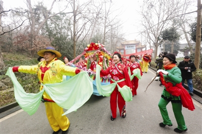 2月6日,大年初二上午,琅琊山醉翁亭风景区,琅琊区古道社区的大妈们舞着狮子挑着花灯向游客们表演民俗花灯《狮子闹春迎新年》,吸引游客停步观赏拍照。