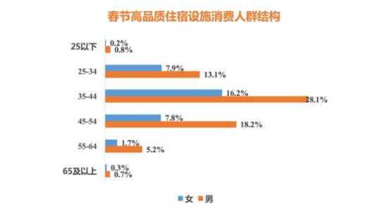 从高品质住宿设施的消费人群来看,35-44岁间的男性居多,消费人次占比达28.1%。中年男性消费者大多收入稳定,且有一定的财富积累,更愿意为住宿的体验性买单。