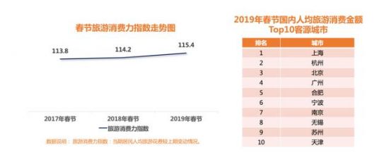 随着国民收入结构的整体提升,国内假期旅游正向高质量转型。近三年来,春节旅游消费力指数持续增长,达115.4。从人均旅游消费金额来看,上海、杭州、北京、广州、合肥、宁波、南京、无锡、苏州及天津为Top10客源城市。