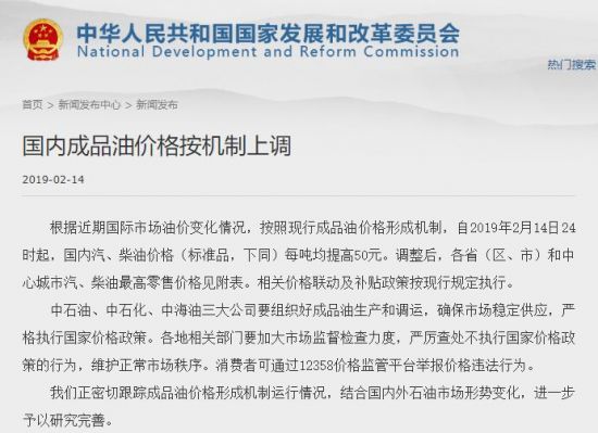 人民网北京2月14日电 (记者朱传戈) 根据“十个工作日一调整”的原则,新一轮成品油调价窗口将于今天(14日)24时开启。国家发改委刚刚发布通知,根据近期国际市场油价变化情况,按照现行成品油价格形成机制,自2019年2月14日24时起,国内汽、柴油价格(标准品,下同)每吨均提高50元。本次调价是2019年第3次上调,也是年内首度“三连涨”。