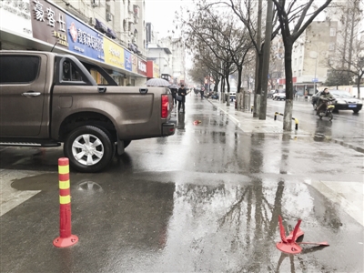 而在隔离桩被撞坏的非机动车道和旁边的人行道上,记者看到这里随意停放了几辆机动车和电动三轮车。凤凰西路上的一户商家告诉记者,这里的车辆乱停乱放和占道经营现象一直十分严重,春节前安装隔离桩后,这种现象确实有所改善。但随着隔离桩逐渐被撞坏,这种现象又出现了“反弹”,真叫人头疼!