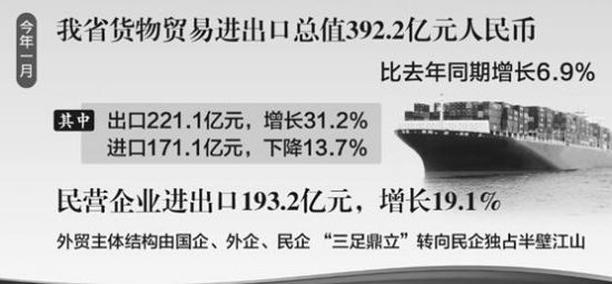 在去年1月外贸值创历史开年新高的基础上,今年1月,我省货物贸易进出口总值392.2亿元人民币,直逼400亿元大关,比去年同期增长6.9%。其中,出口221.1亿元,增长31.2%;进口171.1亿元,下降13.7%。
