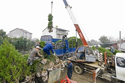 2月25日,来安县舜山镇林桥村村民正在忙着销售蜀桧(塔柏)树苗。
