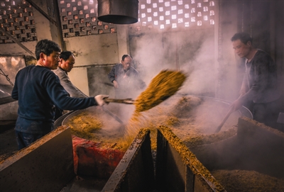 图为2月25日下午,工人们正在酒糟车间紧张忙碌中。