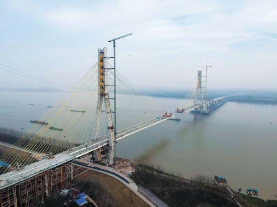 3月4日拍摄的池州长江公路大桥钢箱梁吊装施工现场。池州长江公路大桥长5.818千米,主跨828米,北主塔高237米,目前,大桥引桥部分全部完工,施工单位利用难得的晴好天气加紧最后的钢箱梁及斜拉索吊装施工,全桥预计3月底合龙,6月底建成通车。通讯员 詹俊 张洪兵 摄
