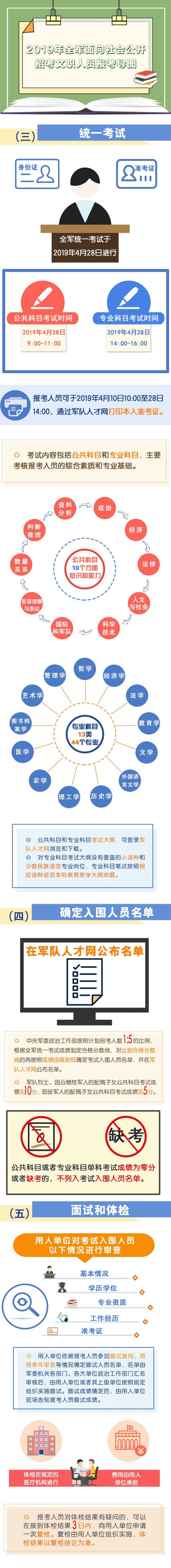 这次公开招考,着眼服务部队需要,主要招录一批文职人员到主干专业系列、重点关键岗位和艰苦边远地区;注重引进优质人才,严把标准条件,精准按岗择人,提高人才选拔质量,从源头上建强文职人员队伍;坚持做到公平公正,岗位数量、资格条件、选拔程序、录用结果“四公开”,确保招考全程阳光透明。根据计划安排,3月13日至20日,报考人员可通过军队人才网报名,4月28日全军组织统一考试。考试内容包括公共科目和专业科目,各科目考试的范围、内容和具体要求已在军队人才网公布。9月底前,完成面试体检、政治考核、综合考察、公示审批等工作。