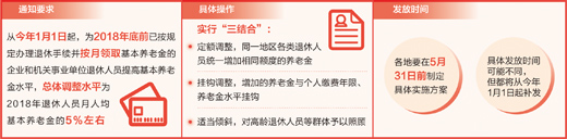 此外,今年养老金调整将继续坚持并轨原则,继2016年以来连续第四年同步安排适当提高企业和机关事业单位退休人员养老金水平。“自2016年以来,在中央和地方政府的共同努力下,企业和机关事业单位实行完全统一的调整办法的省份不断增加。”人社部相关负责人说,今年国家将继续加快调整办法统一步伐,充分体现基本养老金调整政策的公平性,进一步实现规则公平。