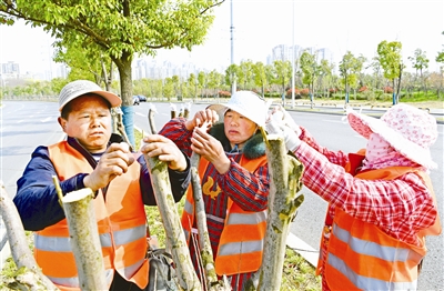3月25日上午,滁城西涧路上,园林工人正在对绿化带中的紫薇树实施嫁接“手术”,一条条被美国皇家园艺协会授予“花园优异奖”的红火箭的枝条被插入紫薇树枝中。记者从市园林局了解到,继治理法梧飘絮之后,滁城今年的绿化养护提升又迎来新动作——对滁城西涧路、中都大道、南谯南路、丰乐大道4条道路上的约3000株速生紫薇树进行试点嫁接。如果嫁接成功,等到明年夏季紫薇花盛开的季节,这些路段的紫薇花将开得更红更艳,成为滁城一道亮丽风景。