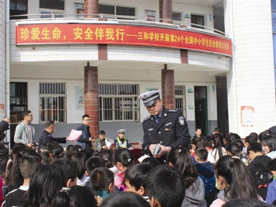 滁州网讯 为进一步提高中小学生交通安全意识和文明意识,增强交通法制观念和自我保护意识,有效预防减少涉及学生道路交通事故发生,日前,定远县交警大队联合定远三和集镇政府、派出所、司法所走进三和学校,开展以“珍爱生命,安全伴我行”为主题的安全教育日活动。