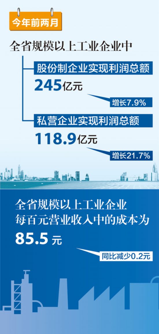 股份制企业和私营工业企业发展活力增强,利润增长较快。前两个月,股份制企业实现利润总额245亿元,增长7.9%;私营企业实现利润总额118.9亿元,增长21.7%。由于上游领域供给能力趋于稳定、价格涨势趋缓及去年同比基数较高等原因,全省国有控股企业实现利润总额67.7亿元,同比下降16.6%。但上游能源原材料领域仍保持稳健盈利势头,采矿业实现利润总额17.5亿元,同比增长15.1%;电力、热力、燃气及水生产和供应业实现利润总额14.7亿元,增长25.6%。