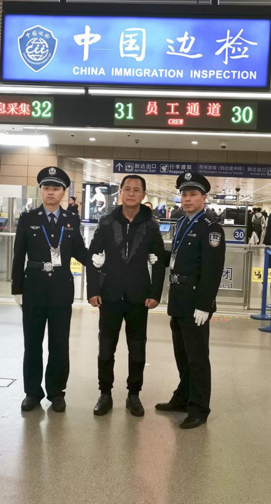 袁国方在机场边检人员的带领下离开飞机从登机口出来(胡高生 摄)