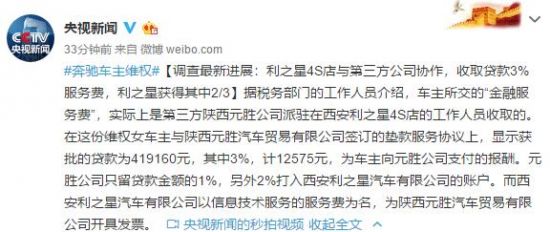 人民网北京4月16日电 据中央电视台新闻中心官方微博消息,税务部门的工作人员介绍,车主所交的“金融服务费”,实际上是第三方陕西元胜公司派驻在西安利之星4S店的工作人员收取的。在这份维权女车主与陕西元胜汽车贸易有限公司签订的垫款服务协议上,显示获批的贷款为419160元,其中3%,计12575元,为车主向元胜公司支付的报酬。元胜公司只留贷款金额的1%,另外2%打入西安利之星汽车有限公司的账户。而西安利之星汽车有限公司以信息技术服务的服务费为名,为陕西元胜汽车贸易有限公司开具发票。