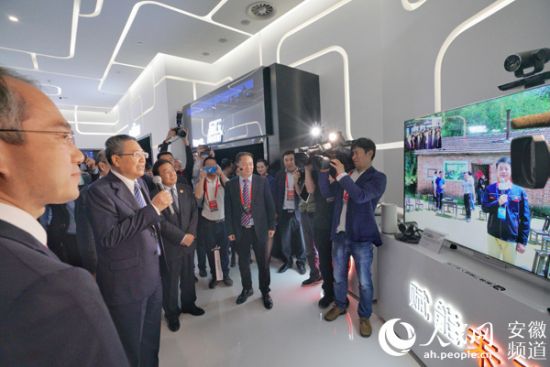 在上午的巡馆环节,安徽省委书记李锦斌来到安徽电信5G展区,手执话筒,通过视频,与在六安市金寨县大湾村现场的电信工作人员进行交流。