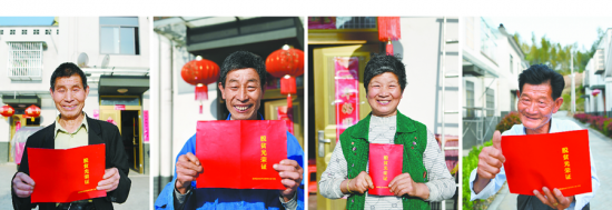 陈泽申、陈泽平、汪能梅、汪达庆(左起)展示脱贫光荣证。三年来,大湾村共有135户368人脱贫。