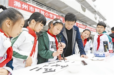 当日是“世界读书日”,由琅琊区教体局、团区委、区文明办主办,解放小学承办的琅琊区“书香满校园 诗书画童年”世界读书日主题队日活动暨“红领巾梦享家”少先队荣誉激励体系建设现场推进会在该校举行。近三十位省、市级书画名家走进校园,挥毫泼墨,书写古诗词,让学生们感受传统文化魅力。