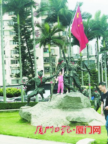 1日上午11时左右,厦门烈士陵园。“手举高点,再高点,摸枪。”人群中的一个女孩很显眼,在父亲的帮助下,她爬上比自己还高的烈士雕像,牢牢抓住烈士的枪,模仿着雕像的动作,等着拍照合影。