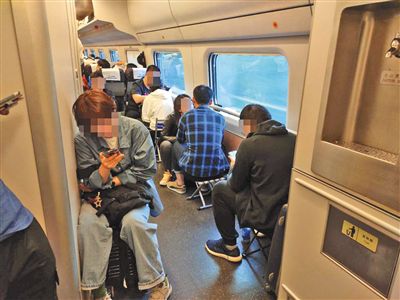 昨日,记者乘坐D22从沈阳到北京,购买沈阳至山海关的车票体验“买短乘长”,补交车费和手续费后,顺利到达北京。该列车15号车厢内,有不少乘客均采用此方式乘车,因无座,不少乘客还自带折叠椅。新京报记者 潘闻博 摄