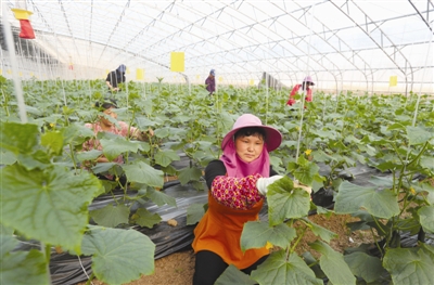日前,定远吴圩镇九梓现代农业示范园大棚内,农民对水果黄瓜藤进行吊挂整枝。