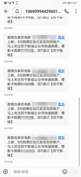8日下午,正在上班的郭先生手机频频响起,“10多分钟收到了12条内容相同的观影短信,太烦人了。”郭先生介绍,短信内容大意为“周五上映一部电影,有购票红包发送至账户……”