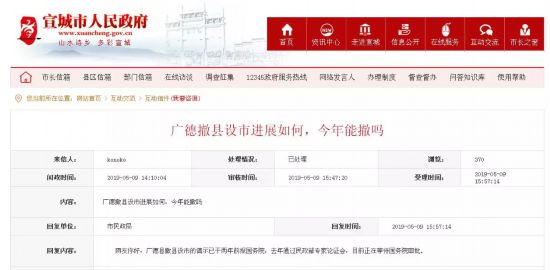 5月9日,有网友在宣城市人民政府“互动交流”栏目发帖询问:广德撤县建市进展如何,今年能撤吗。当天,宣城市民政局就回复称,广德县撤县设市的请示已于两年前报国务院,去年通过民政部专家论证会,目前正在等待国务院审批。
