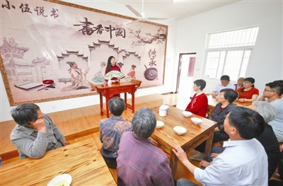 5月13日,在南谯区章广镇鸦窝村农家书屋内,文化协管员伍健正在为村民们说书。为探索新时代文明实践新途径,自去年12月以来,该村创新农家书屋管理模式,开办了每周五《小伍说书》活动,从宣传党的十九大精神到古代道德故事、健康养生、移风易俗等,使农民从读书变成更容易听得懂、记得住的听书。 记者卢志永 特约摄影董 超摄