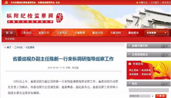 另据枞阳纪检监察网消息,5月8日上午,省委巡视办副主任陈新一行来枞阳县调研指导巡察工作。省委巡视办巡察处负责人刘晓兵,市委巡察办主任胡忠新,县委常委、县纪委书记、县委巡察工作领导小组组长廖志远等参加调研。