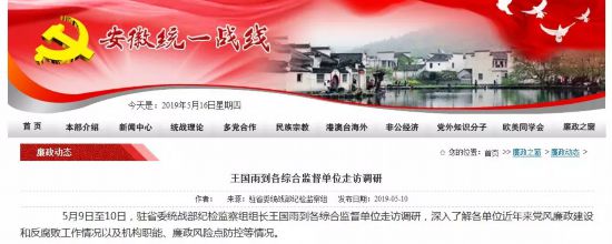 据安徽统一战线官网消息,5月9日至10日,驻省委统战部纪检监察组组长王国雨到各综合监督单位走访调研,深入了解各单位近年来党风廉政建设和反腐败工作情况以及机构职能、廉政风险点防控等情况。