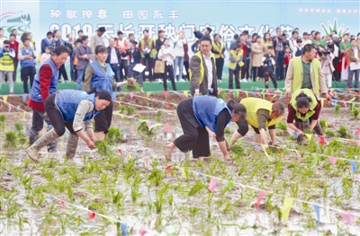 图为选手们在田间进行手工插秧比赛。记者卢志永摄