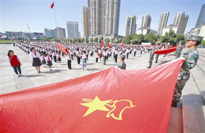 5月21日上午,琅琊区少先队主题队日活动暨新队员集中入队仪式在市人民广场举行。该活动既是以庆祝新中国成立70周年“我爱你·中国”为主题的少先队日活动,也是新队员入队仪式。活动的最大亮点就是五旗传递环节。五位旗手分别从各行业优秀代表手中接过国旗、党旗、军旗、团旗、队旗,少先队员齐声高呼“红色旗帜,代代相传”,传承革命精神,坚定理想信心,共筑伟大梦想。