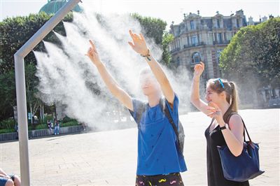 6月28日,在法国北部城市里尔,人们在政府临时安装的降温设施处消暑。