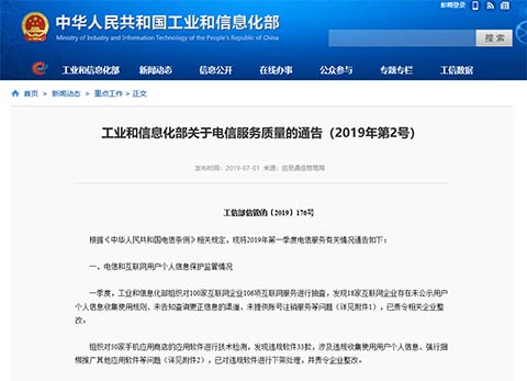 通告称,一季度,工信部对100家互联网企业106项互联网服务进行抽查,发现18家互联网企业存在未公示用户个人信息收集使用规则、未告知查询更正信息的渠道、未提供账号注销服务等问题,工信部已责令相关企业整改。