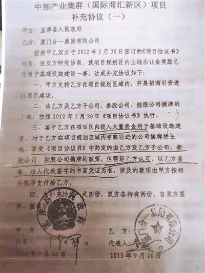 这份签订于2013年9月26日的《中部产业集群(国际商汇新区)项目补充协议(一)》规定,对于厦门合一公司在项目规划区域内招商引进的公司摘牌的土地,享受2012年5月30日所签项目协议书约定的,“由乙方(厦门合一公司)及其子公司、参股公司、控股公司摘牌的政策。”而由此产生的款项,则由孟津县政府按相关程序支付给厦门合一公司。