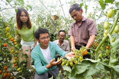 6月25日,大学生冯晓磊在番茄棚指导农户如何科学观察小番茄生长有没有缺钙。
