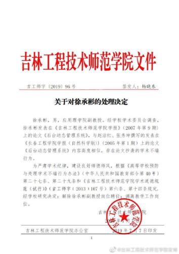 中新网7月7日电 近日,吉林工程技术师范学院副教授徐承彬涉嫌抄袭他人论文事件引发社会关注。吉林工程技术师范学院官方微博7日发布通报称,经学校研究决定,解除徐承彬副教授岗位聘任,调离教学工作岗位。