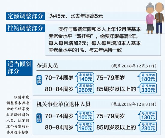 今年,我国确定的总体调整水平为2018年退休人员月人均基本养老金的5%,与2018年退休人员养老金调整比例保持一致。在此前提下,我省既考虑政策的延续性,又兼顾企业和机关事业单位退休人员的特点,确定了定额调整、挂钩调整、适当倾斜的具体调整办法。主要包括:定额部分为45元,比去年提高5元。挂钩部分实行与缴费年限和本人上年12月底基本养老金水平“双挂钩”,缴费年限每满1年,每人每月增加2元;每人每月增加本人基本养老金水平的1%,与去年保持一致。倾斜部分主要体现在对退休早、养老金水平偏低的高龄退休人员的统筹照顾,对年满70周岁至74周岁、75周岁至79周岁、80周岁至84周岁、85周岁及以上(截至2018年12月31日)的企退人员,每人每月分别增加140元、180元、260元、330元;对年满70周岁至74周岁、75周岁至79周岁、80周岁至84周岁、85周岁及以上(截至2018年12月31日)的机关事业单位退休人员,每人每月分别增加100元、130元、190元、230元。以前年度调整基本养老金时已经享受过高龄倾斜的人员,达不到上述标准的补齐到上述标准。