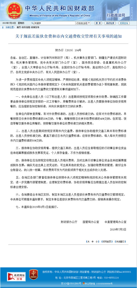 人民网北京7月18日电 据财政部官网消息,财政部、国管局、中直管理局近日印发《关于规范差旅伙食费和市内交通费收交管理有关事项的通知》。