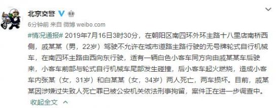 人民网北京7月18日电(记者 白宇)据北京市公安局公安交通管理局官方微博消息,2019年7月16日3时30分,在北京市朝阳区南四环外环主路十八里店南桥西侧,戚某某(男,22岁)驾驶不允许在城市道路主路行驶的无号牌轮式自行机械车,在南四环主路由西向东行驶,适有一辆白色小客车同方向由戚某某车后驶来,小客车前部与轮式自行机械车尾部发生碰撞,后小客车起火燃烧,造成小客车内张某(女,31岁)和白某某(女,34岁)两人死亡,两车损坏。目前,戚某某因涉嫌过失致人死亡罪已被公安机关依法刑事拘留,案件正在进一步调查中。