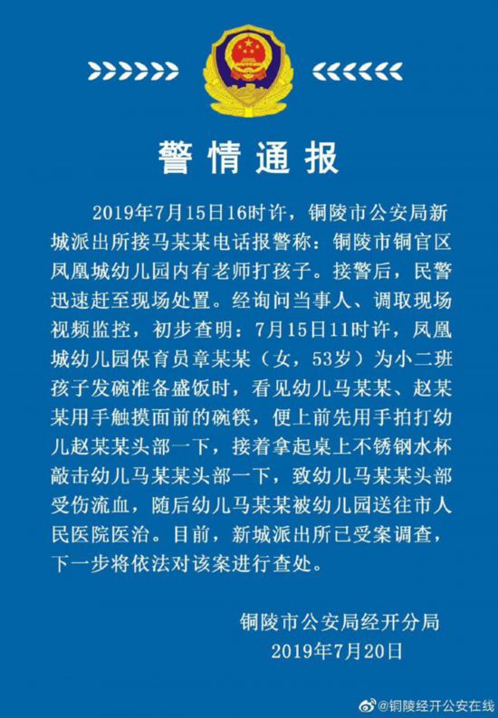 中安在线、中安新闻客户端讯 7月20日,铜陵公安局经开分局发布警情通报称,2019年7月15日16时许,铜陵市公安局新城派出所接市民电话报警,得知铜官区凤凰城幼儿园内有老师打孩子。接警后,民警迅速赶至现场处置。