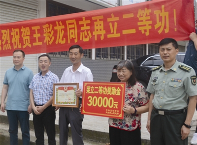7月27日,天长市军地联合向空军某部两年内第二次荣立二等功飞行员王采龙家庭送喜报。